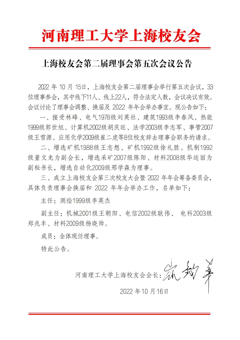 2022年10月15日,上海校友会第二届理事会举行第五次会议,33位理事参会,其中线下11人、线上22人,符合法定人数,会议决议有效。会议讨论了理事会调整、换届及 2022 年年会举办事宜。现公告如下: