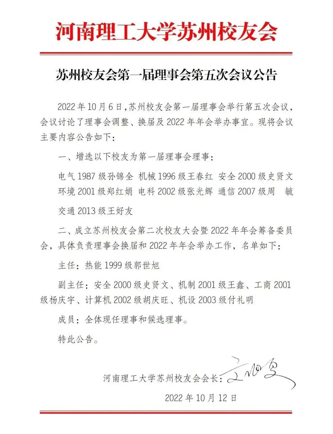 2022年10月6日,苏州校友会第一届理事会举行第五次会议,会议讨论了理事会调整、换届及2022年年会举办事宜。现将会议主要内容公告如下: