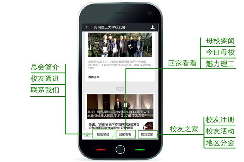 “河南理工大学校友会”官方微信公众平台(以下简称“校友会微信公众平台”)由校友会主办,是宣传学校、服务校友的重要载体,目前开设有“校友总会”“回家看看”“校友之家”三大功能菜单,每项菜单下面又有三个子菜单,共计“总会简介”“校友通讯”“联系我们”“母校要闻”“今日母校”“魅力理工”“校友注册”“校友活动”“地区分会”9个菜单。校友会微信公众平台推送的内容包括学校新闻、史海钩沉、校友活动、校友动态、校友文萃等。校友会微信公众平台的开通,将更好地宣传学校办学成就、服务海内外校友,让天南海北的理工校友感受母校脉搏,寄托母校情怀。