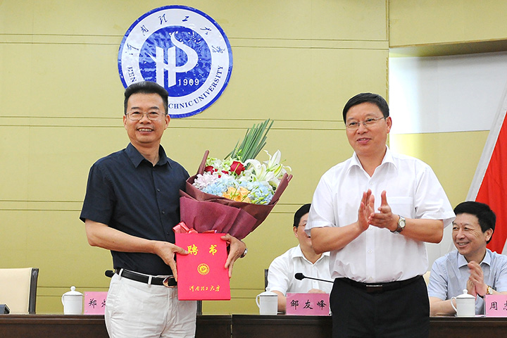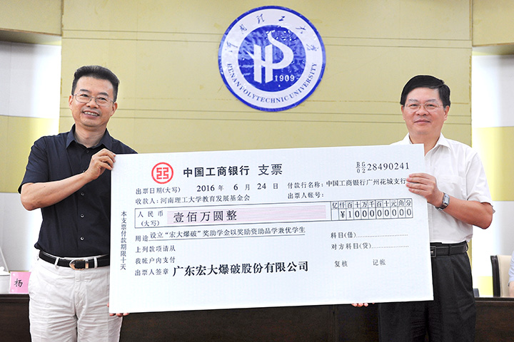 会上,杨小林向郑炳旭颁发河南理工大学兼职教授聘书。邹友峰代表学校教育发展基金会接受广东宏大爆破股份有限公司捐赠的一百万教育基金,并回赠捐赠证书。