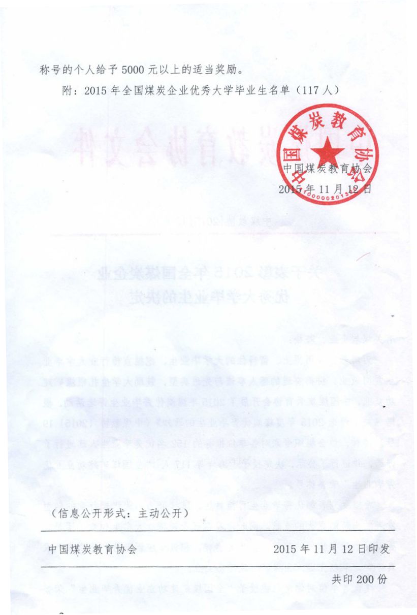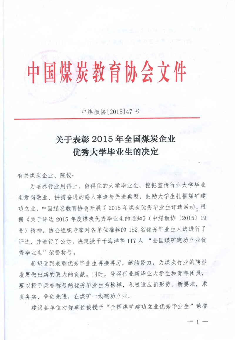 近日,中国煤炭教育协会开展了2015年煤炭优秀毕业生评选活动,从各单位推荐的157名优秀毕业生评选出117人“全国煤炭建功立业优秀毕业生”荣誉称号,我校陈攀等10位校友获此殊荣。