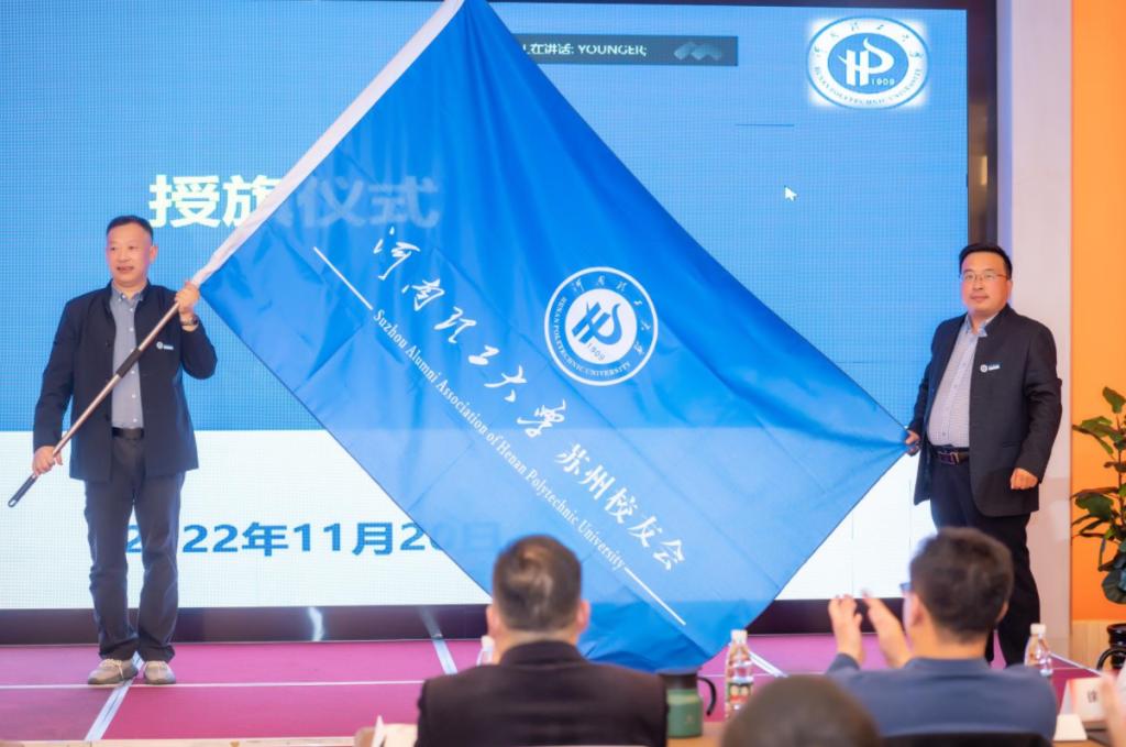 在与会校友、嘉宾热烈的掌声中,郭世旭从文海更手中接过了“河南理工大学苏州校友会”的大旗。郭世旭在履新发言中表示,从海更会长手中接过苏州校友会的会旗,就意味着扛起了沉甸甸的责任,将与第二届理事会校友一起,团结带领苏州广大校友,充分发挥桥梁纽带作用,搭建交流平台,服务校友、服务母校,为母校建设国内一流特色高水平大学做出新的更大贡献。