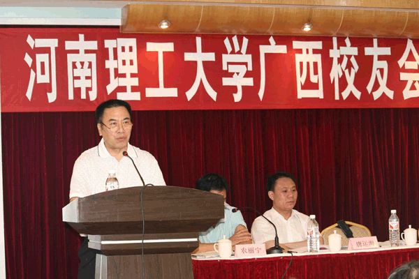当选校友会会长、广西工业设计院党委书记、地勘72级校友董远杰,名誉会长、广西煤炭地质局局长徐培武,校友代表广西宣州市委常委、副市长、研96级校友唐运海,校友代表广西工业设计院助理工程师、采煤05级校友淦千在会上发了言。董远杰会长讲话中说:“感谢母校和校友的支持与信任,我们一定会在校友总会的领导下,严格遵守《河南理工大学校友会章程》和《河南理工大学广西校友会章程》,加强服务,交流信息,增进情谊,相互促进,共同发展;以校友会为平台,为母校的发展增光添彩、为广西的经济发展和繁荣贡献力量;认真宣传,积极发动校友踊跃参加母校百年校庆活动”。